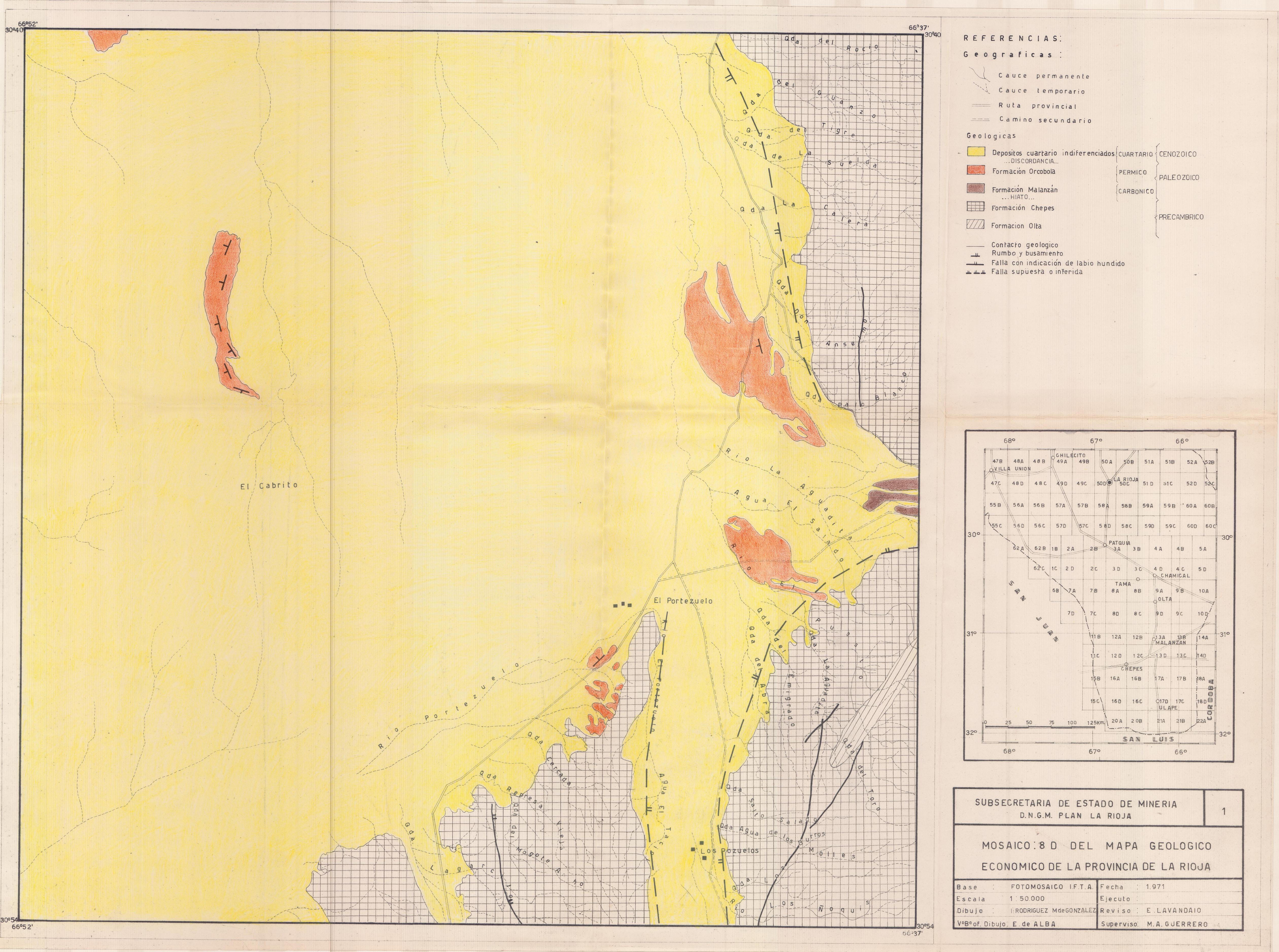 Este informe forma parte del mosaico del mapa geológico económico del Plan La Rioja, el cual puede accederse en http://repositorio.segemar.gov.ar/handle/308849217/1871