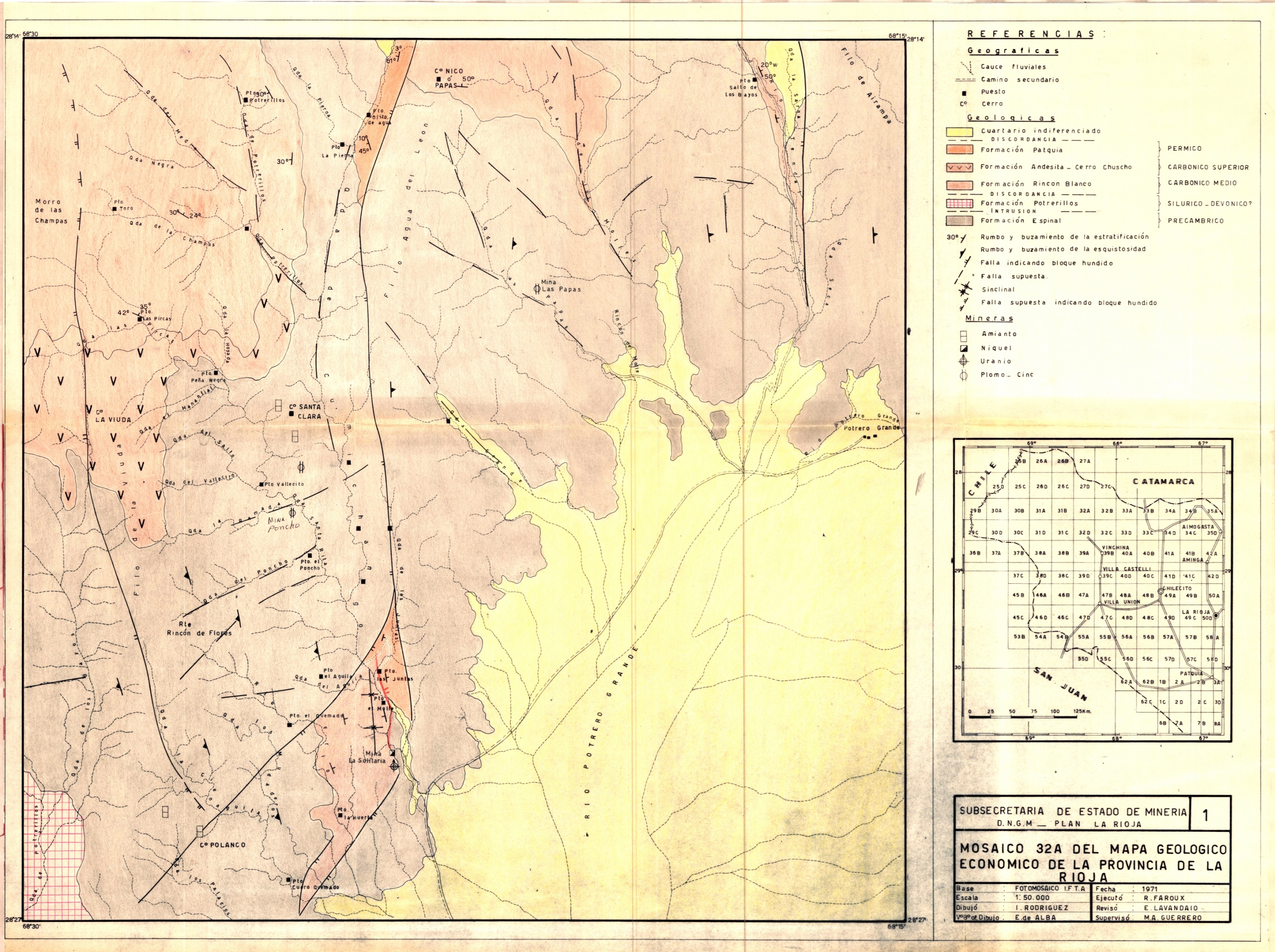Argentina. Dirección Nacional de Geología y Minería. Plan La Rioja, 1971. Descripción del Mosaico 32A del Mapa Geológico Económico de la Provincia de La Rioja. La Rioja, Dirección Nacional de Geología y Minería. Plan La Rioja (ex Delegación Plan Cordillera Norte)