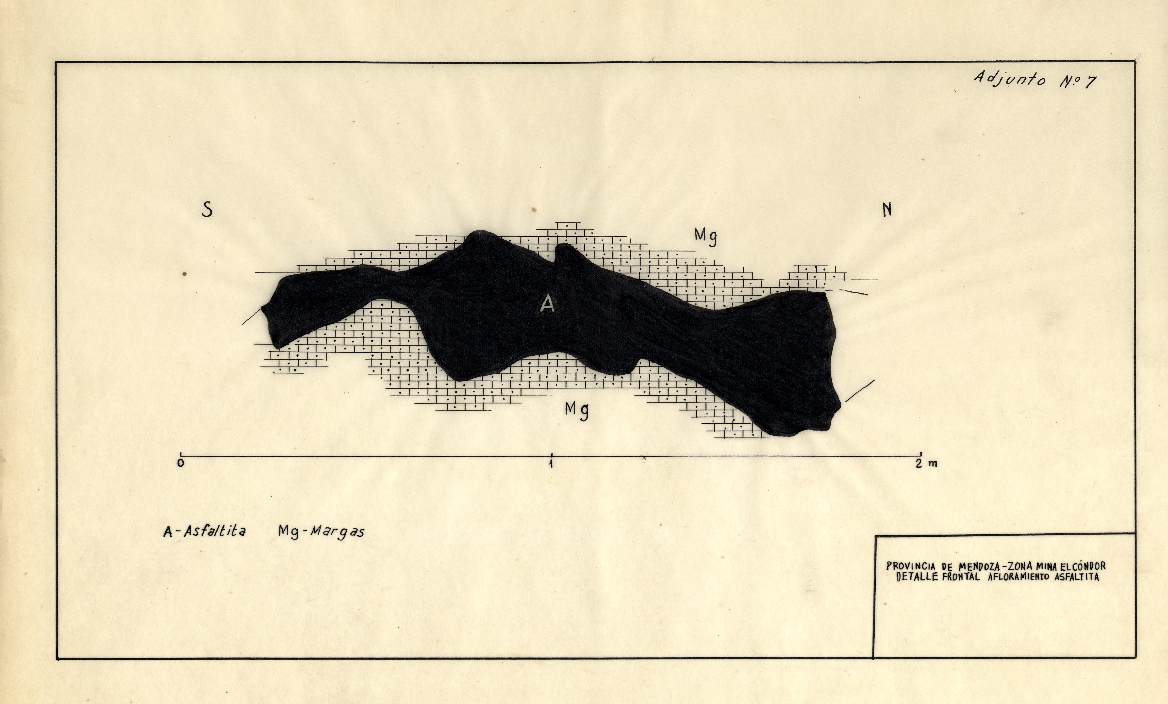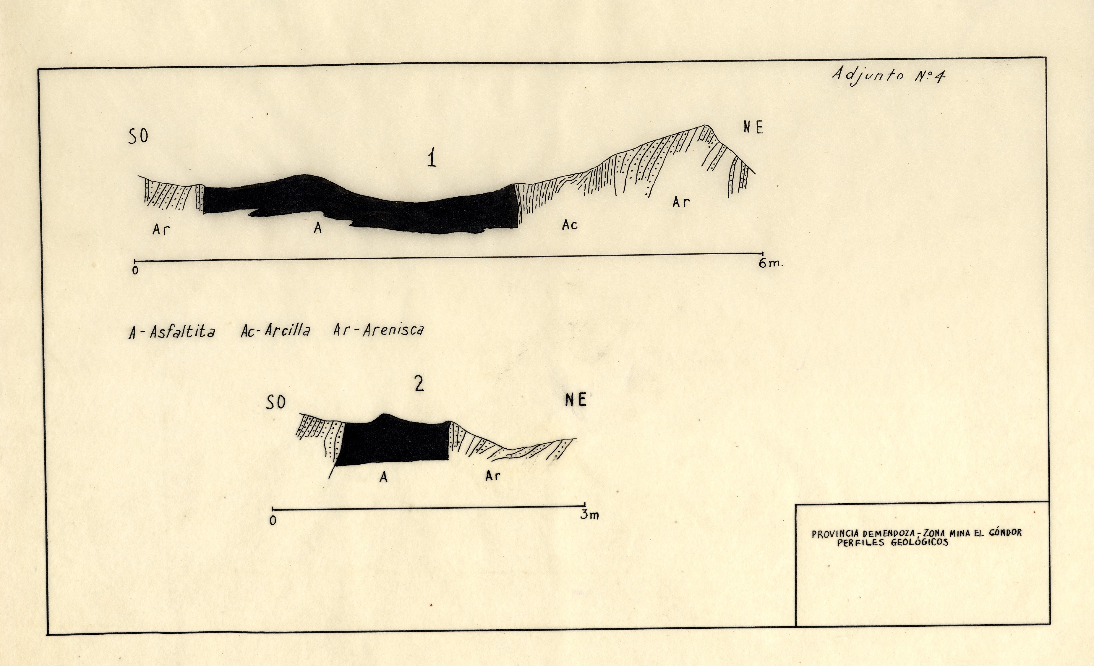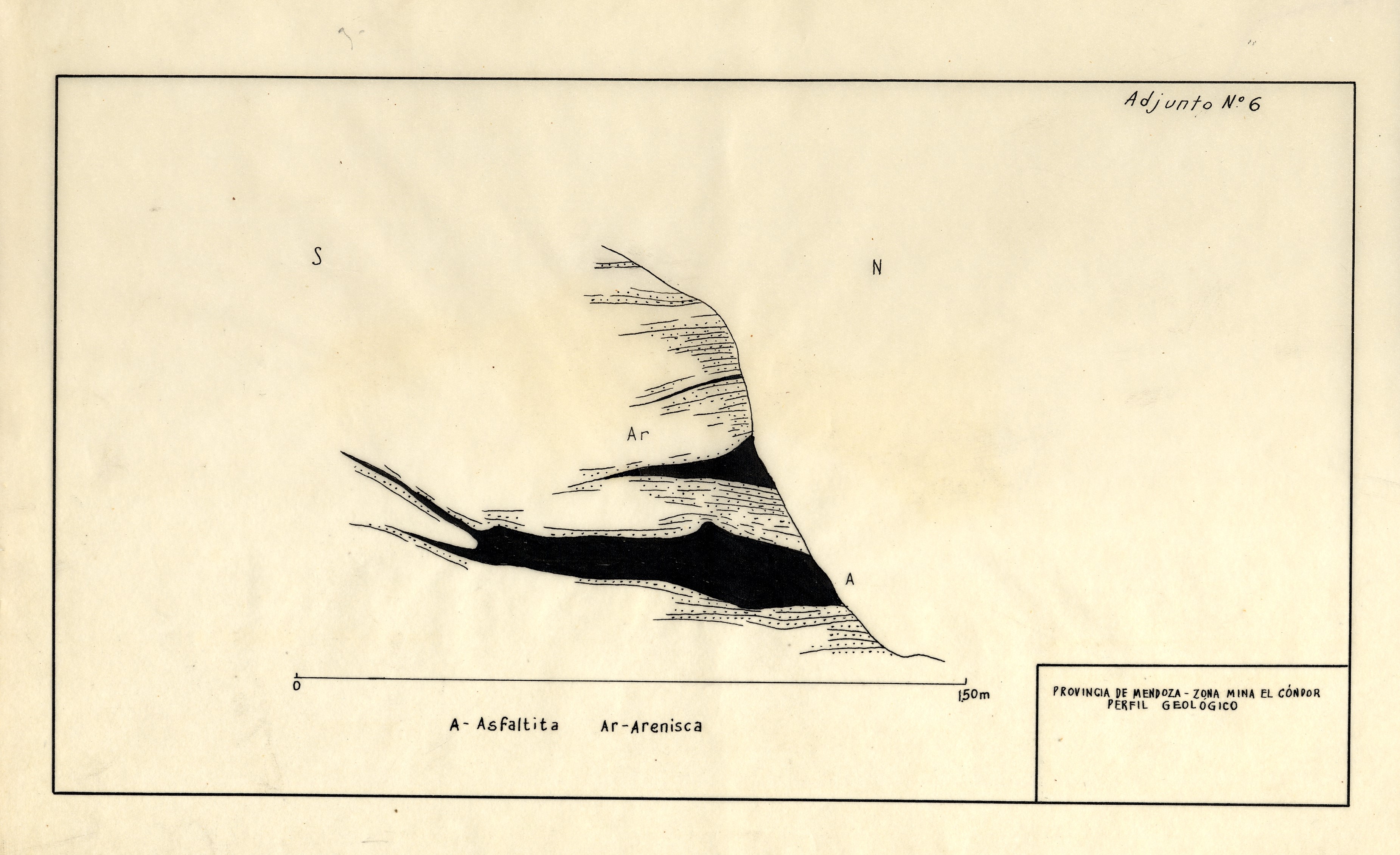 Informe sobre los depósitos de asfaltita ubicados en la Mina "El Cóndor", situados sobre la frontera con Chile, a escasa distancia del lugar donde el Hito Obelisco del Cerro Bayo señala el deslinde internacional. El informe incluye 7 planos de los cuales incluye un croquis de ubicación de la Mina El Cóndor a Escala 1:1.250.000 y un plano del Departamento de San Rafael a Escala 1:100.000.