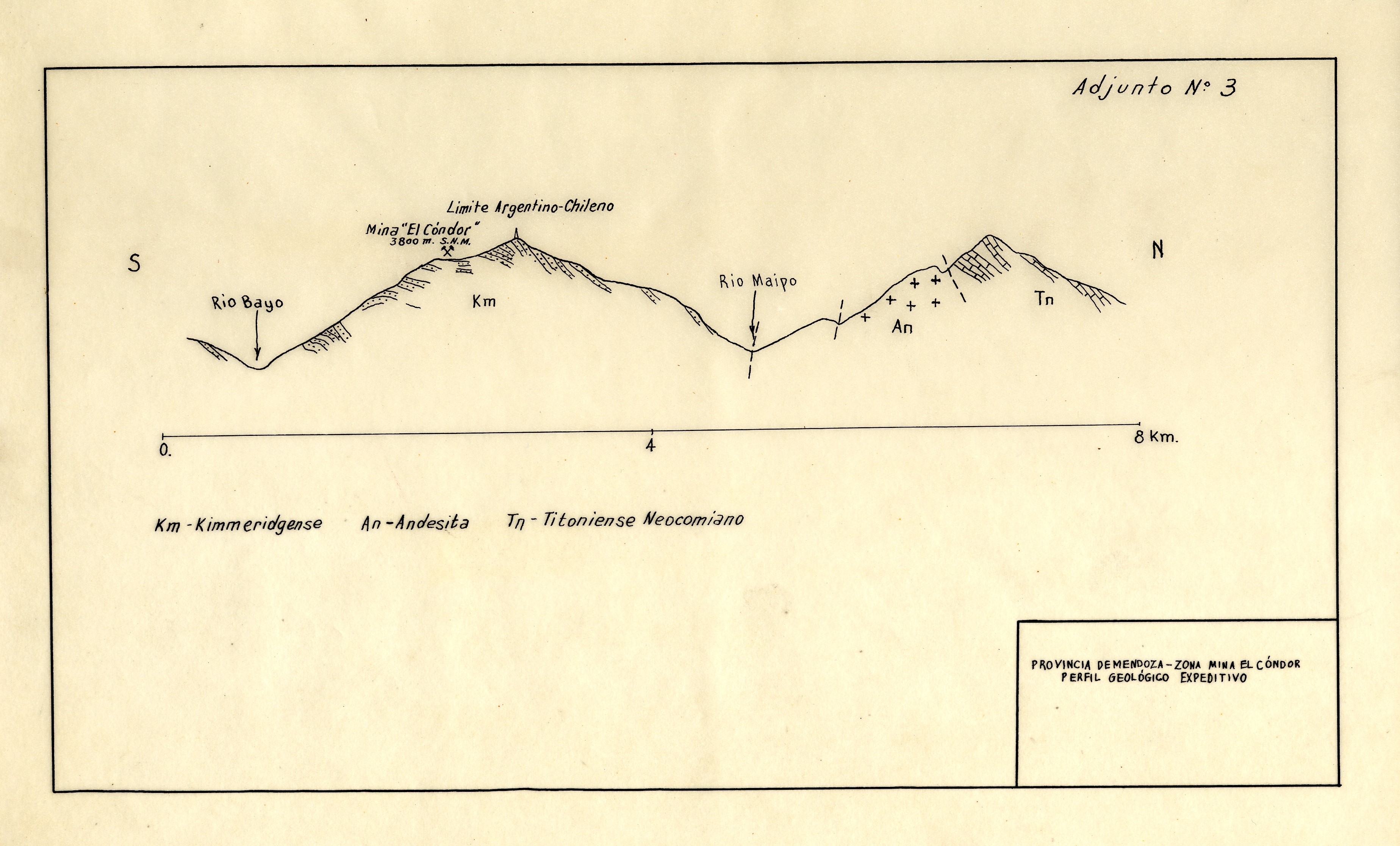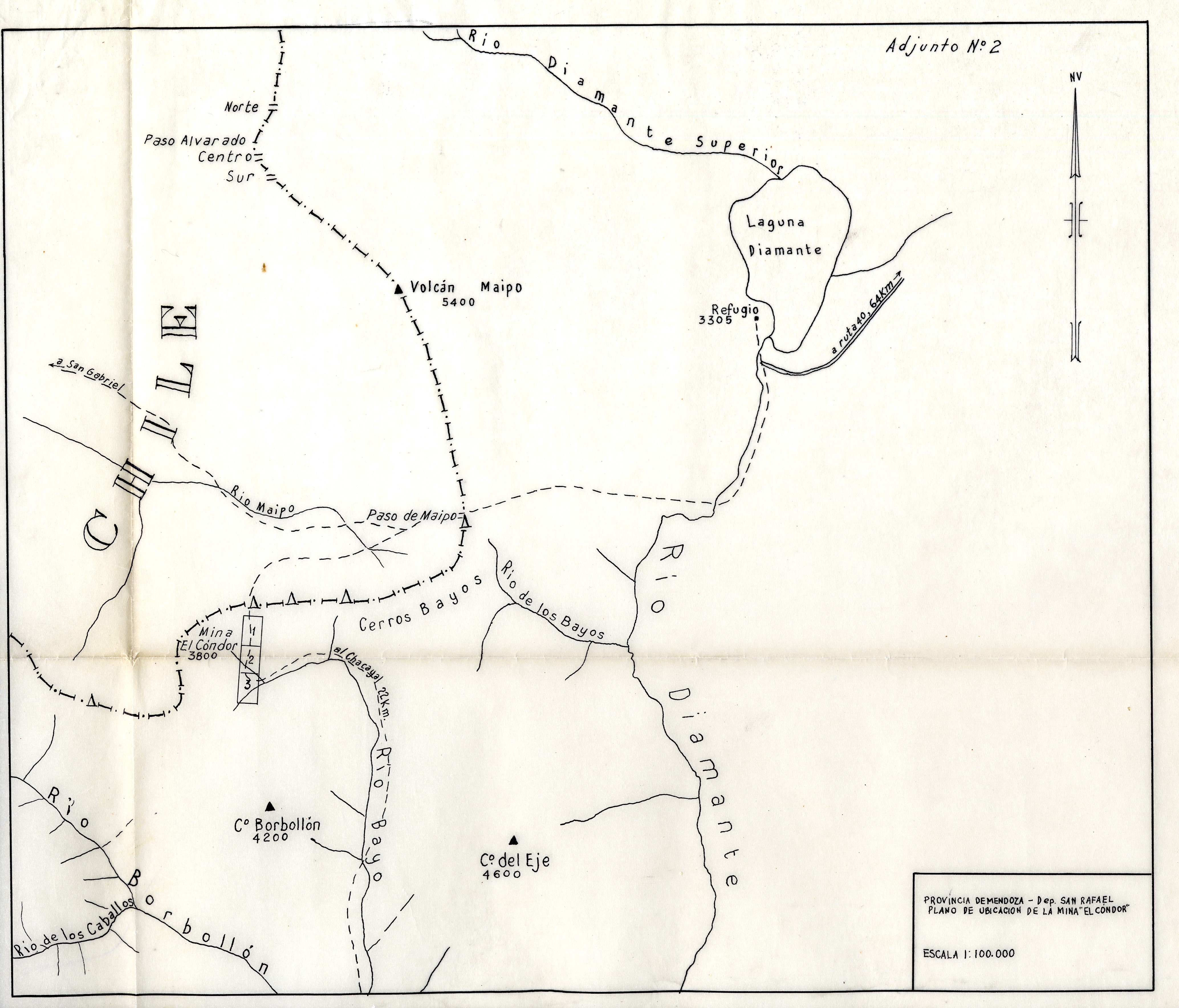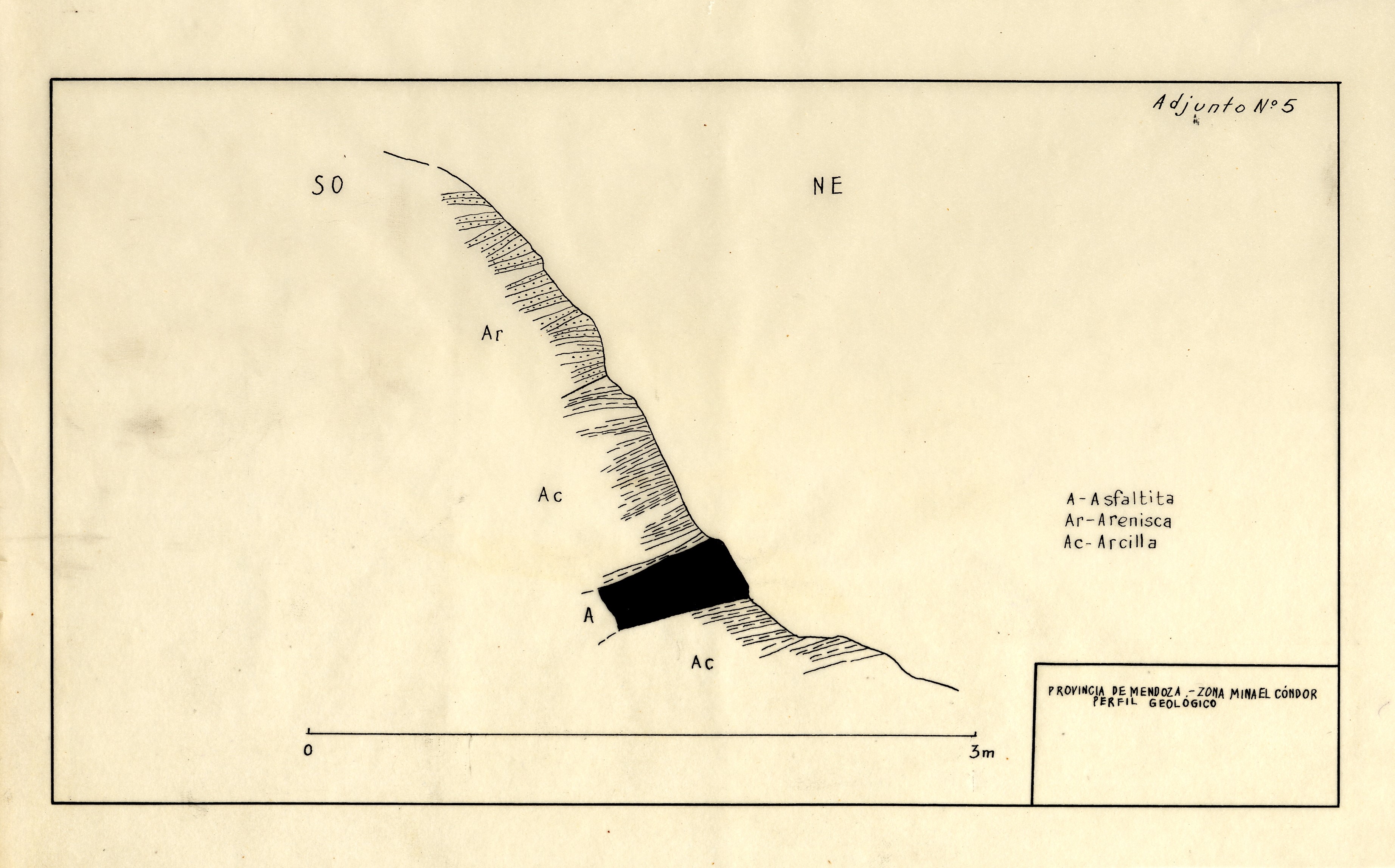 Informe sobre los depósitos de asfaltita ubicados en la Mina "El Cóndor", situados sobre la frontera con Chile, a escasa distancia del lugar donde el Hito Obelisco del Cerro Bayo señala el deslinde internacional. El informe incluye 7 planos de los cuales incluye un croquis de ubicación de la Mina El Cóndor a Escala 1:1.250.000 y un plano del Departamento de San Rafael a Escala 1:100.000.